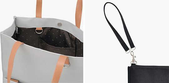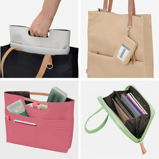 A series of small items containing 7 items including tote bags and bag in bags. This series is mainly targeting women in their thirties from the late teens. D-rings are attached to the outside and the inside of the bag in the tote bag, you can hang the pass holders and pouches of the same series. We supervised the design.