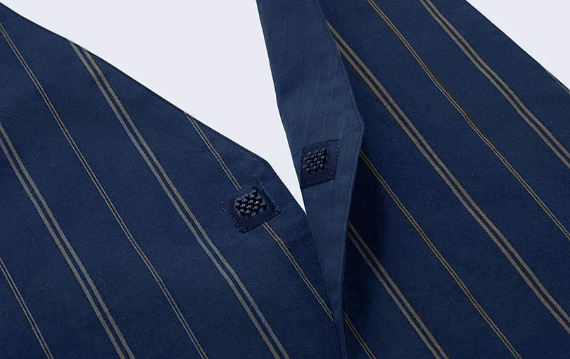 食べこぼしても洋服の汚れを気にせず、食事を楽しむことができるエプロンです。着脱しやすいストール形状で、服の上から着けても違和感がなく、フォーマルな場所でも自然な装いです。プリーツタイプ、ベストタイプの2種があります。ベストタイプの布地は「播州織」(兵庫県)の先染織物です。